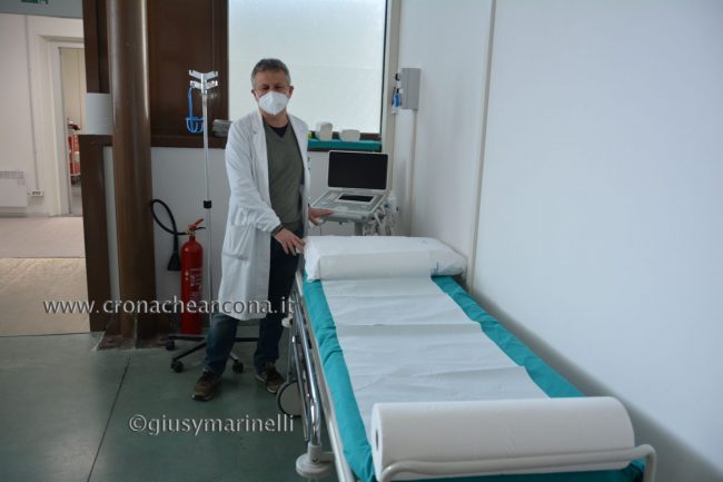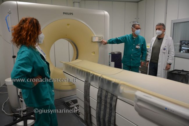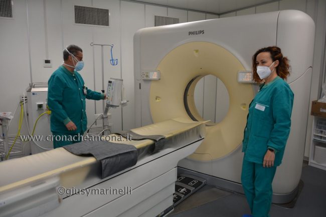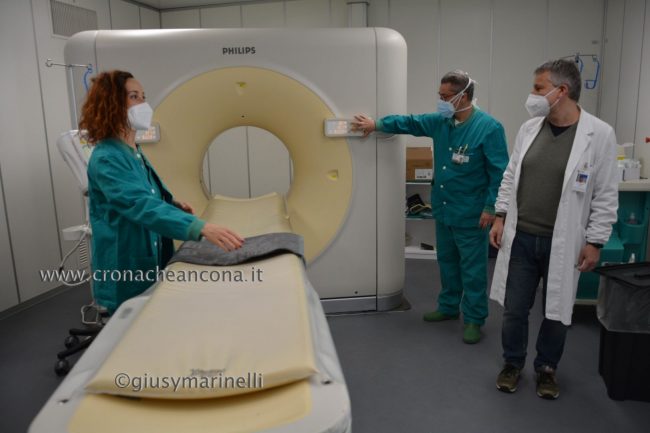 Ulteriori posti letto per ricoverare i pazienti positivi e una Tac esterna riservata al percorso Covid. Sono queste le soluzioni adottate dall’ospedale di Torrette per far fronte all’emergenza pandemica. La Tac, a 64 strati, entrerà in funzione questo pomeriggio ed è stata collocata in un container posizionato nel piazzale antistante il pronto soccorso. Sarà riservata ai pazienti Covid per lasciare ‘intatta’ l’altra Tac, funzionale ai degenti che non hanno contratto il virus. Funzionerà H24. L’azienda ha noleggiato l’apparecchio per tre mesi, fino al 7 giugno, a un costo complessivo di quasi 183mila euro. Nel frattempo, è stata decisa una rimodulazione della gestione degli spazi: saranno una trentina i posti letto in più per ricoverare i pazienti Covid. Aree ulteriori verranno ricavate nelle sale operatorie e al quinto piano dell’ospedale, occupato dal reparto di Pneumologia. Deciso anche l’allargamento dell’area Cov-4 con una delibera pubblicata la scorsa settimana (leggi l’articolo).