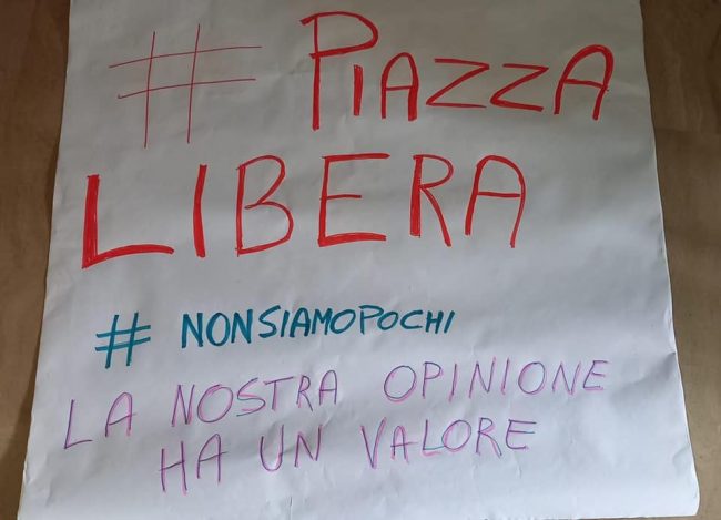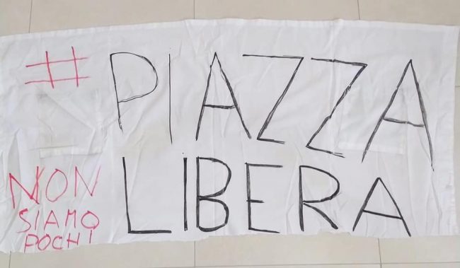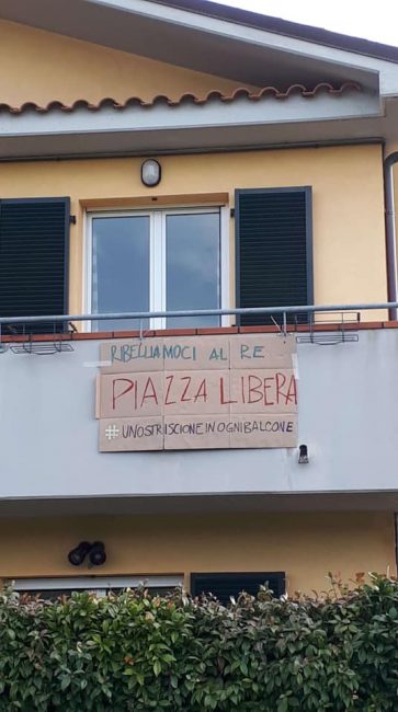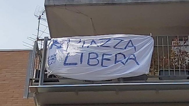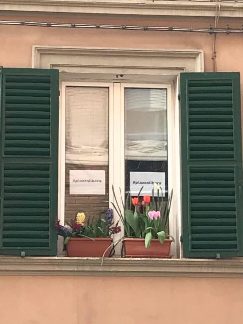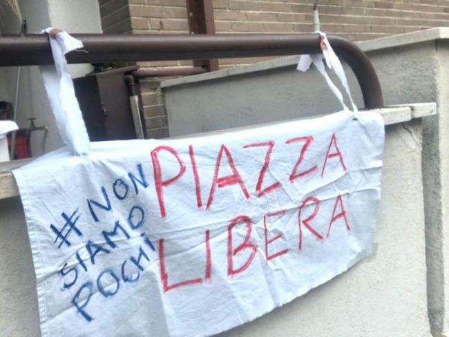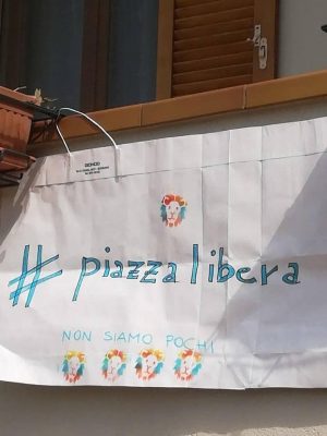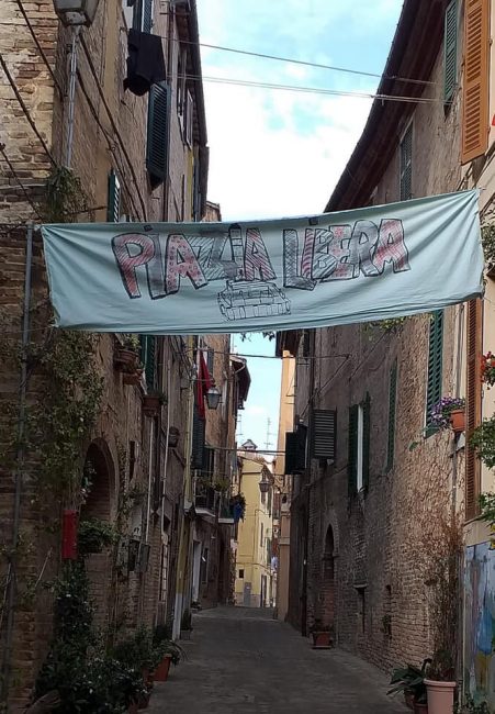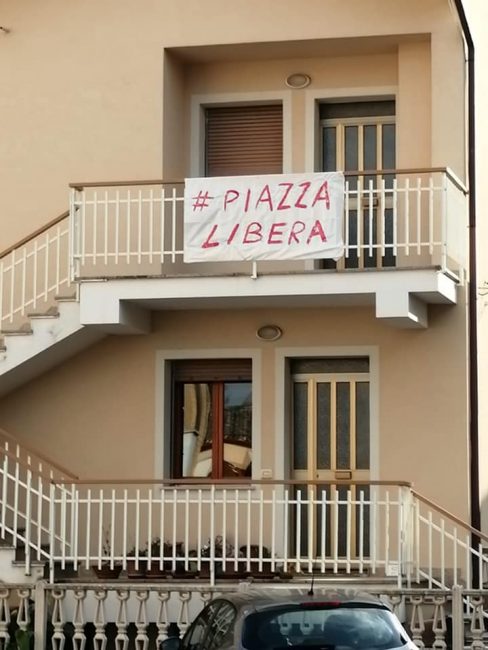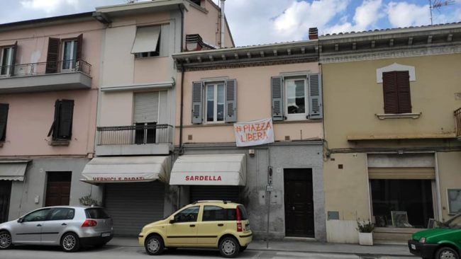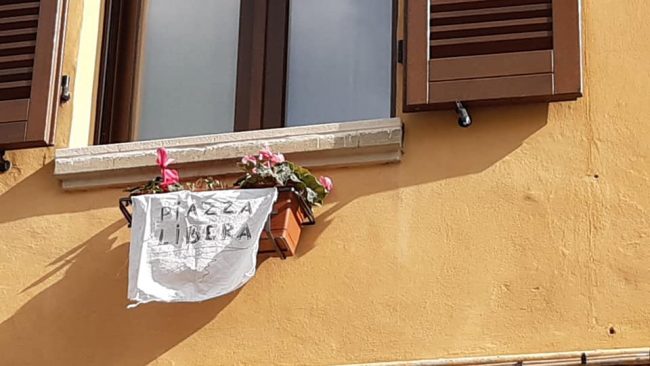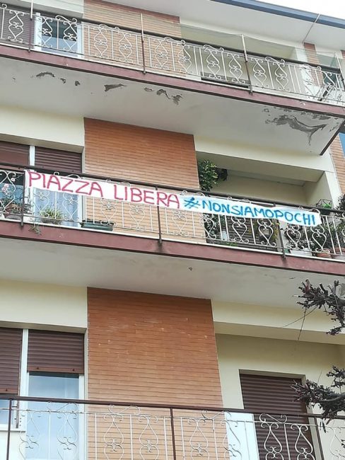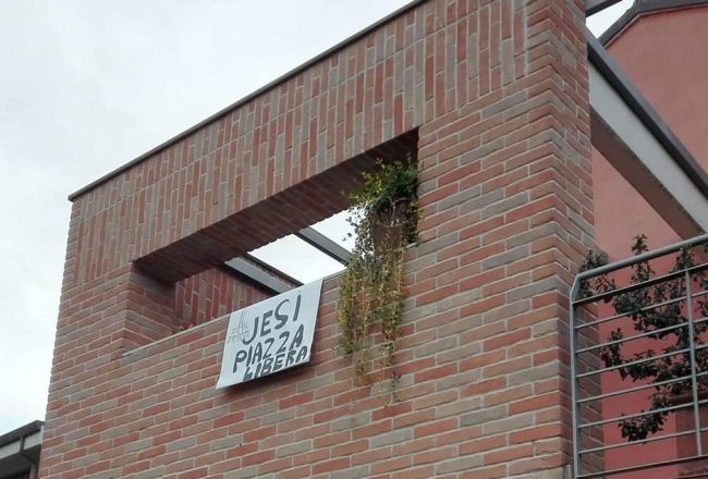 La manifestazione del Comitato ‘Piazza Libera’ invitava a esporre uno striscione in ogni balcone di Jesi per dire no allo spostamento della fontana dei leoni da piazza Federico II e piazza della Repubblica.