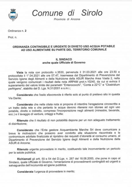 Rete idrica contaminata da batteri enterococchi con valori sopra la soglia di legge. Da questa mattina è emergenza acqua per Sirolo. Dopo la comunicazione dell’Asur Marche- Area Vasta 2 con la quale venivano comunicati i risultati della nota Arpam con il superamento del valore limite , il sindaco Filippo Moschella ha subito firmato un’ordinanza che vieta l’ uso potabile e alimentare (diretto-indiretto compresa l’incorporazione negli alimenti come minestre o bevande, e il lavaggio di verdure, ortaggi e frutta), dell’acqua del rubinetto su una parte del territorio comunale, nelle abitazioni comprese tra Piazza Gigli, via Sanzio, via Giulietti, via Puccini, via Cilea e via Vivaldi, tutte le vie all’interno delle mura del centro storico, via Grilli, via Pascoli, via Canaletti, via Gaudenti ,via San Francesco fino all’incrocio con via Marconi (via Marconi esclusa). Copia dell’ordinanza è stata inviata al gestore del servizio Acquambiente Marche per predisporre immediatamente tutti gli interventi necessari per ripristinare la qualità dell’acqua della rete in conformità ai parametri di legge e per sollecitare l’arrivo delle autobotti. I punti di approvvigionamento idrico temporaneo si trovano al parcheggio di via Vivaldi, all’altezza dei civici 1-5, e al parcheggio via Grilli. «Siamo in bassa stagione e la situazione, tra l’altro non nuova, è sotto controllo – spiega il sindaco Filippo Moschella – sono in costante contatto con Anquambiente Marche e spero che il problema sia risolto nell’arco di pochi giorni. La comunicazione dell’Asur è arrivata intorno alla mezzanotte di ieri e ci siamo subito attivati per contenere al massimo i disagi nella zona del centro storico».