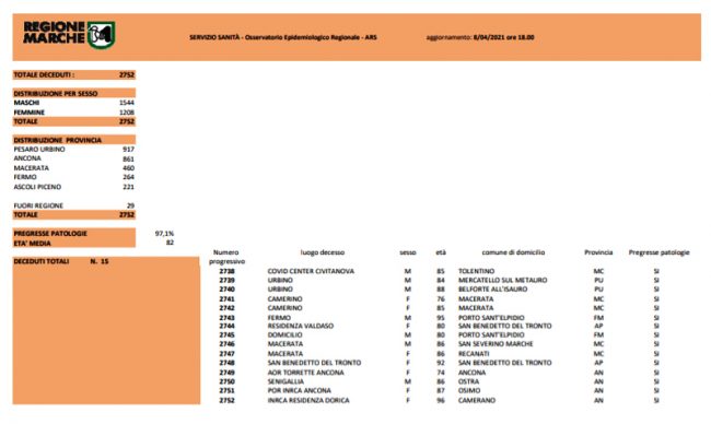 Covid, quattro morti in provincia di Ancona, 15 nelle Marche. È il dato dell’ultimo Bollettino del Servizio sanità sui decessi legati alla pandemia. Nell’Anconetano sono morti una 74enne di Ancona, un 86enne di Ostra, una 87enne di Osimo e una 96enne di Camerano. Tra le altre vittime registrate nella regione un 84enne di Mercatello sul Metauro, un 95enne di Porto Sant’Elpidio, una 80enne di San Benedetto, un 80enne di Porto Sant’Elpidio, una 92enne di San Benedetto. In provincia di Macerata non ce l’ha fatta una donna di 85 anni che aveva contratto il Covid in ospedale a Macerata (era ricoverata nel reparto di Cardiologia dove c’è stato un focolaio). La donna si è spenta all’ospedale di Camerino, un uomo di 85 anni di Tolentino, una 76enne di Macerata, una 86enne di Recanati e un 86enne di San Severino.