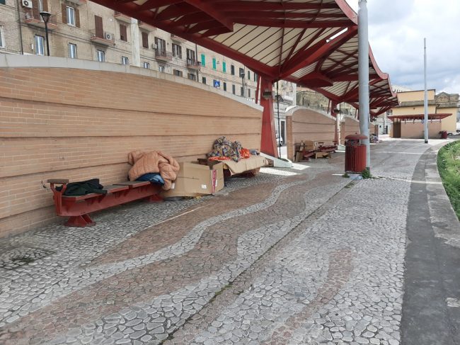 Già, molti. Perché è imponente la massa di materiale utile per passare in qualche modo le notti un po’ al riparo dal freddo e dalle intemperie che giace praticamente in ogni punto dell’ex stazione. Materassi, piumini, coperte, giacche a vento e altri indumenti, tante scarpe, grandi cartonati, scatoloni con qualche genere di conforto “arredano” il fronte mare dell’immobile, con le otto lunghe panchine sotto le tettorie, e i marciapiedi all’esterno dei locali di servizio, compresi quelli igienici. Si tratta del punto di estemporaneo ricovero più ampio nella mappa dei tanti luoghi (edifici pubblici e privati, parchi, sottoscala, magazzini, garage e altri impianti urbanistici) abbandonati ad Ancona, per chi un appartamento piccolo ma decoroso non riesce proprio ad ottenerlo dalle istituzioni. Un buco nero di degrado e umana disperazione del resto noto proprio alle autorità istituzionali. Tanto che è “teatro” di una specie di andazzo tipo la “tela di Penelope”. Il paragone che richiama il celebre stratagemma narrato nell’Odissea può sembrare spericolato, ma rende l’idea. Penelope, nell’interminabile attesa del ritorno del marito Ulisse ad Itaca, la notte disfaceva la tela funebre alla quale lavorava ogni giorno. In questo caso gli attori in campo sono due: forze dell’ordine, addetti comunali e di AnconAmbiente, che più o meno una volta ogni uno-due mesi, fanno piazza pulita di tutto il materiale citato; e i senza fissa dimora, che dopo qualche tempo tornano coi loro poveri beni a dormire sulle panche o per terra. Un buco nero di degrado e umana disperazione noto anche alle associazioni come Caritas, Servizio di Strada, Avvocati di strada (di Ancona) e Tenda d’Abramo e Ribò (di Falconara) che danno più di una mano ai due Comuni per alleviare le sofferenze di queste persone per troppi “invisibili”.