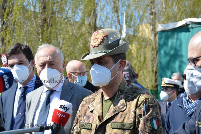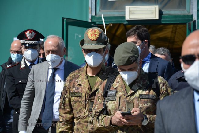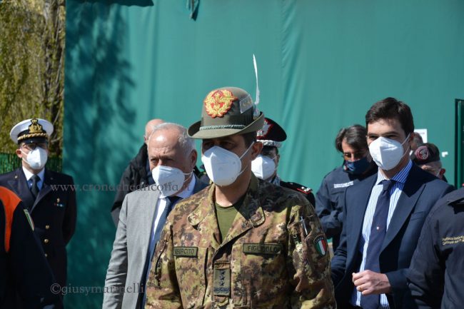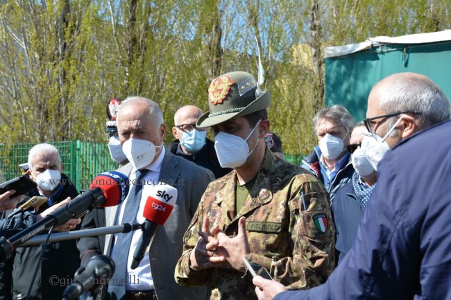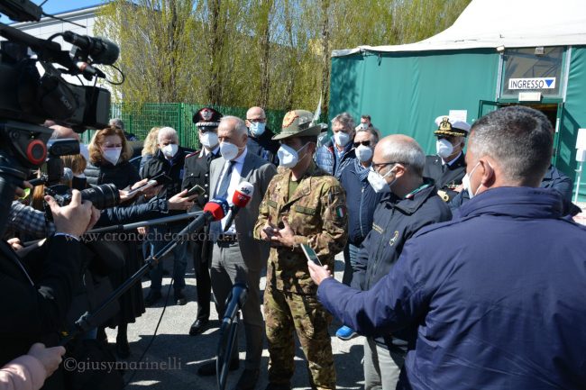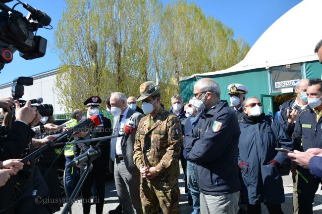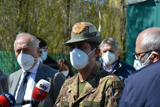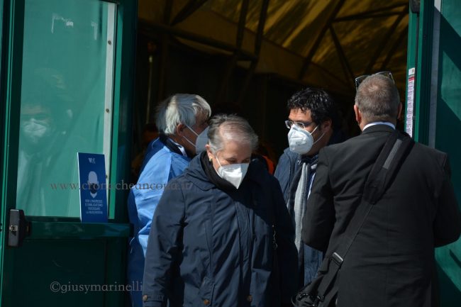 Il faro di Roma puntato sulle Marche. Questa mattina. il generale Francesco Paolo Figliuolo, commissario per l’emergenza Covid, e Fabrizio Curcio, capo della Protezione civile, hanno prima inaugurato il nuovo punto vaccinale di Piediripa di Macerata, per poi spostarsi nella struttura dorica allestita al Paolinelli. “Tour” che sta ancora proseguendo con una serie di incontri a Palazzo Raffaello per essere aggiornati sull’andamento del piano vaccinale marchigiano. Ad accogliere i vertici della struttura commissariale davanti al Paolinelli, la sindaca Valeria Mancinelli. «Qualcuno può pensare che sia una passerella ma così non è – ha esordito il generale – Con l’ingegner Curcio, capo della Protezione civile, e su invito delle Regioni, vogliamo verificare che i target vengano raggiunti a livello numerico e ci siamo quasi. Dobbiamo arrivare quasi alle 10mila somministrazioni per poi raggiungere a fine mese per le Marche le 15mila. E’ importante vedere anche la qualità della campagna vaccinale e la Regione Marche sta facendo un grande sforzo per gli over80 e i fragili: i numeri parlano. Per gli over 80 siamo a 100.000 dosi inaculate su 130mila, pari al 73% rispetto alla media nazionale del 62-63% . E’ un buon dato ed esorto la Regione Marche come le altre ad andare avanti su queste categorie che hanno la maggiore incidenza ed i maggiori esiti negativi derivanti da questa infida pandemia. Mettiamo in sicurezza gli over 80 e adesso, con Astrazeneca, gli over 60»