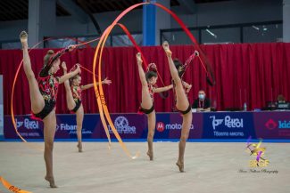 Il week-end pasquale è stato il “battesimo” della Nazionale Italiana Junior in preparazione nel Centro Tecnico Federale di Fabriano, trasferite ormai da mesi in pianta stabile nella città della carta e seguite dalle tecniche Julieta Cantaluppi, Laura Zacchilli e la coreografa Bilyana Dyakova. L’Italbaby accompagnata proprio dal duo Cantaluppi e Zacchilli vola a Sofia (Bulgaria) per affrontare il primo impegno internazionale: il Torneo Sofia Cup. In prima giornata la compagine formata da Gaia Pozzi, Alice Capozucco, Chiara Badii, Martina Lamberti, Ginevra Pozzato affronta l’esecuzione alle cinque palle. Ottengono il punteggio di 27.850 che le colloca al sesto posto. Nella seconda giornata la formazione in pedana formata da Gaia Pozzi, Alice Capozucco, Chiara Badii, Martina Lamberti, Lorjen D’Ambrogio con l’esecuzione ai cinque nastri ottengono il punteggio di 19.800 che le colloca al quinto posto. Nella classifica generale all-around la Nazionale Italiana Junior guadagna così la quinta posizione. Si conclude con le finali per attrezzo, nell’ultima giornata, la prima esperienza Internazionale della Squadra Nazionale Junior. L’Italbaby purtroppo termina al settimo posto la finale alle cinque palle e in ottava posizione l’esecuzione ai cinque nastri. Esecuzioni entrambe macchiate da molti errori che saranno utili per tornare a lavorare più motivate di prima.