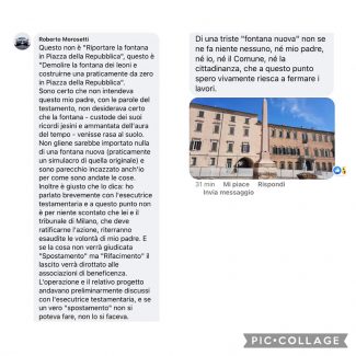 In un secondo post il figlio dell’artista specifica di non essere mai stato a Jesi «se non due giorni nel 1998), non ho mai visto quella fontana, non sapevo di che materiale fosse fatta. Ma se mi si parla di “spostamento”, io, letteralmente, intendo “spostamento”. Poteva essere fatta di blocchi di marmo, scomponibili e trasportabili. Ho scoperto solo adesso che era formata da una parte nobile (a occhio il 20 per cento) e da una parte tecnica». Chiarisce inoltre di essere «solo un osservatore, non sono parte in causa, non ho voce in capitolo e l’unico coinvolgimento che mi riguarda è di tipo sentimentale. Sapendo quanto mio padre era legato per mille motivi che nessuno conosce a quella fontana, ho sofferto vedendo le fotografie della sua demolizione». Si accoda alle obiezioni di Roberto Morosetti anche il comitato Piazza Libera che da mesi ormai si oppone al trasloco della fontana e dell’obelisco. «Le parole del figlio di Morosetti sono molto chiare, è molto probabile che oltre ad essere senza piazze per non si sa quanto, oltre a non avere più la Fontana dei Leoni, saremo noi tutti a pagare questo scempio, senza nessun tesoretto da spendere per Jesi. Oltre il danno, la beffa» sottolinea il Comitato promotore del referendum.