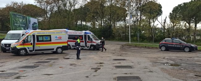 I mezzi di soccorso confluiti in via D’Ancona, a Osimo, per salvare la vita all’autotrasportatore di 68 anni