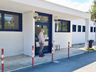 Il sindaco Simone Pugnaloni davanti all’ingresso della piscina comunale di Osimo