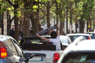Bandiere, striscioni e caroselli in Largo XXIV Maggio, davanti al palazzo del popolo di Ancona.