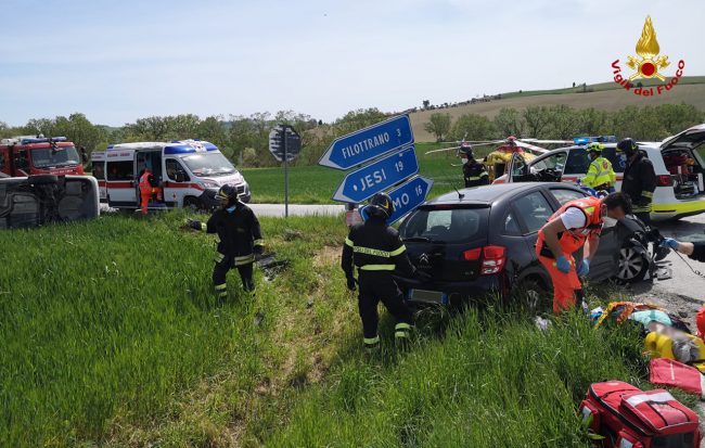 I vigili del fuoco sono intervenuti nella mattinata a Filottrano, lungo la Sp362 denominata in quel tratto via Imbrecciata, per soccorrere automobilisti e passeggeri coinvolti in un incidente stradale. Per cause da accertare due autovetture, una Ford Mondeo e una Citroen C3, si sono scontrate tra loro. La Ford, dopo l’urto si e rovesciata nel campo adiacente alla strada. La squadra di Osimo intervenuta poco dopo le 11 sul posto con un’autobotte ed un mezzo 4×4 ha collaborato con i sanitari del 118 per estrarre i feriti dalle auto. Uno di questi, il conducente della Ford, rimasto sempre lucido e cosciente, e stato trasportato con l’eliambulanza al pronto soccorso dell’ospedale di Torrette di Ancona, mentre gli altri tre occupanti della C3, due uomini e una donna, sono stati accompagnati in ambulanza nello stesso ospedale regionale di Ancona. La squadra dei vigili del fuoco ha provveduto successivamente alla messa in sicurezza della zona dell’intervento. Sul posto anche i carabinieri di Filottrano ed la Polizia locale.