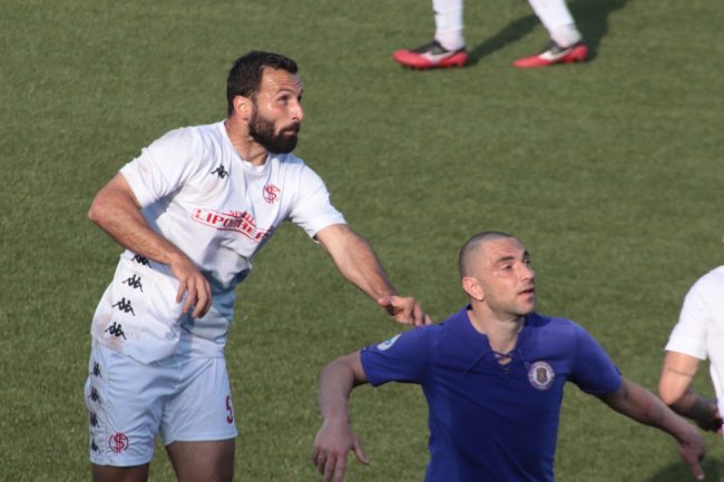 Salvatore Mastronunzio, grande ex della gara, contrastato da un difensore dell’Anconitana