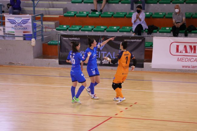 È il Città di Falconara che si aggiudica gara-1 dei quarti playoff contro il Cagliari al termine di una partita che mette in chiaro che nel futsal non occorre mai abbassare la guardia. Sul 5-0 le ragazze di Neri si rilassano e le sarde ne approfittano per accorciare le distanze e tentare il blitz nel finale. Al termine c’è comunque soddisfazione e la voglia di presentarsi giovedì prossimo in Sardegna per gara-2 che vale l’accesso alla semifinale. Bellissima gara delle azzurre marchigiane. Le Citizens fanno girare bene la palla e dopo 5 minuti la sblocca capitan Luciani con un diagonale perfetto. Passa un minuto, sassata di Isa Pereira che Falconi devia e Marta fa la fotografia sottomisura del 2-0. Cagliari subito in affanno e padrone di casa che ne approfittano: al 10’ bell’assist di Guti per Dal’maz che supera Falconi ma il Cagliari si salva sulla linea. Il 3-0 arriva sui piedi della caparbietà di Ferrara che si incunea in area, conquista il penalty, lo calcia e lo mette dentro. Ancora Falconara sulle ali dell’entusiasmo. Al 13’ Nona semina il panico in area avversaria, la difesa cagliaritana si salva su Rubal ben appostata in area. Ancora la Wizard al 17’: deliziosa palla per Dal’maz e tacco beffardo che Falconi riesce a deviare in corner. La prima conclusione sarda arriva al 19’ con Marcon, Dibiase senza problemi. Ultimo minuto con le Citizens in avanti e Dal’maz che cerca la marcatura. Falconi dice noi sia a lei che a Luciani. Nella ripresa la trama della partita non cambia. Citizens ancora in gol con Marta. Splendido: il lancio perfetto di Nona e il tocco sotto, spalle alla porta, della spagnola sull’uscita dell’estremo cagliaritano. Il divario si allunga, dopo i tentativi di Luciani e Ferrara, al 12’30’’ Dal’maz riesce a sbloccarsi al termine di un’azione corale che piega la difesa e fa capitolare Falconi. È il gol che “accontenta” un po’ le falconaresi e infatti il Cagliari ne approfitta. Marchese scatenata en fa due: sugli sviluppi di un corner e poi dopo aver strappato la palla dai piedi di Marta. Il Cagliari a quel punto, due minuti dal termine, prova il portiere di movimento. Finale in difesa per le ragazze di Neri che si compattano e non ne sbagliano più una nonostante la pressione delle avversarie.