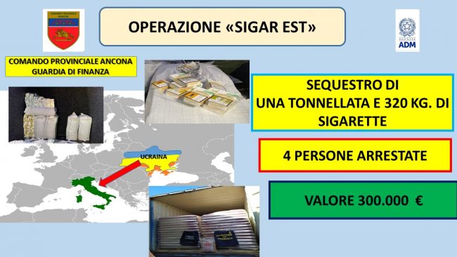 Maxi traffico di sigarette di contrabbando: stroncata organizzazione che portava il tabacco dall’Ucraina alla costa adriatica dell’Italia, passando per il porto dorico. L’operazione – denominata “Sigar Est” – ha visto operare congiuntamente i finanzieri della Compagnia e del G.I.C.O. di Ancona e i funzionari dell’Ufficio delle Dogane di Ancona. L’indagine è scattata a seguito di un controllo effettuato tramite l’apparato scanner in dotazione alle Dogane effettuato su un container proveniente dall’Ucraina, contenente legname in pellet e destinato ad una società di Ascoli Piceno. In particolare, il monitoraggio delle merci negli spazi doganali dello scalo dorico ha portato al controllo scanner di un container sulla base della sospetta disomogeneità dei prodotti trasportati rispetto a quanto dichiarato. Ciò induceva gli operanti a procedere allo scarico totale della merce, scoprendo così, abilmente occultate nel carico, quattrocento chili di sigarette di contrabbando, in stecche, marca Marlboro, Winston e Glamour, custodite in bustoni in plastica. A seguito del primo sequestro, sono state avviate ulteriori indagini, durate alcuni mesi, dalle quali emergeva l’esistenza di un sodalizio criminale internazionale composto da soggetti di nazionalità ucraina e da italiani.