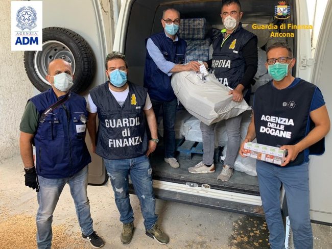 I primi, stando agli investigatori, avevano il compito di finanziare l’acquisto delle sigarette e organizzare l’esportazione del container dal porto di Odessa; ai secondi spettava di gestire il carico una volta arrivato nello scalo marittimo di Ancona. Nel corso delle indagini, i componenti della gang sono stati sorpresi in flagranza di reato dai finanzieri nei pressi di un capannone utilizzato come punto di stoccaggio e situato in provincia di Teramo, proprio mentre caricavano su due furgoni le “bionde” giunte dal porto di Ancona a bordo di un autoarticolato. In manette sono finiti due cittadini ucraini di 30 e 45 anni, uno dei quali con precedenti specifici, e due italiani, rispettivamente di 58 e 65 anni, residenti ad Ascoli Piceno ed entrambi con precedenti penali; in seguito due di loro sono stati condannati a tre anni e otto mesi di reclusione, il terzo è stato condannato a quattro anni, mentre per il quarto seguirà il processo con rito ordinario. In totale, gli operatori delle Dogane e i finanzieri hanno posto sotto sequestro una tonnellata e 320 chili di sigarette di contrabbando e del relativo carico di copertura, composto da diciotto tonnellate di pellet in sacchi, due furgoni, una autovettura e otto cellulari. Le sigarette sarebbero state verosimilmente immesse sul mercato clandestino, con basi in Puglia, nelle Marche e in Emilia Romagna, fruttando circa 300mila euro di introiti illeciti nonché́ causando una ingente evasione fiscale, quantificabile in quasi 250mila euro, tra accise ed Iva.