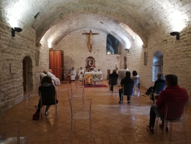 La prima funzione religiosa nella chiesa del monastero benedettino di San Silvestro di Fabriano, dopo la guarigione dalla Sars CoV2 dei monaci
