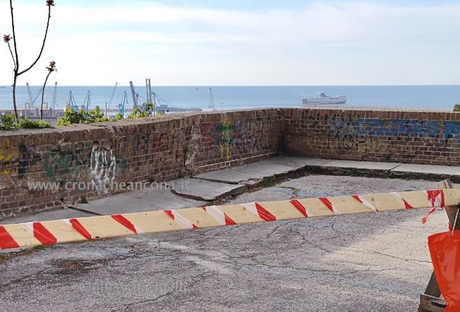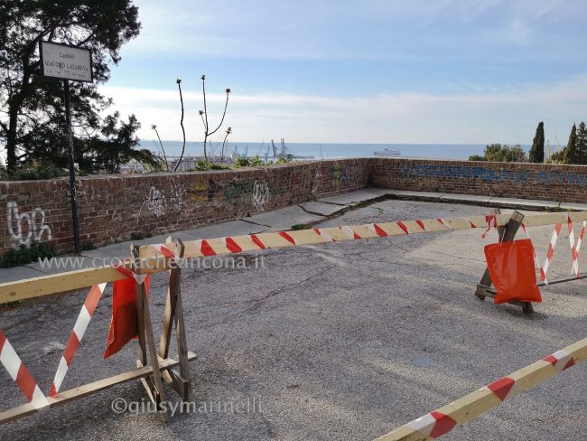 Sul lato opposto, “resiste” in qualche modo al passare dei decenni la targa che ricorda la medievale Porta Capodimonte, eretta nel 1335 e demolita dopo la fine della seconda guerra mondiale dai militari alleati. Addossata alla rupe della fortezza della Cittadella, la porta fu fino al 1789 l’ingresso principale della città da sud (attuali vie Giambattista Pergolesi e Raffaello Sanzio). Pochi anni prima, nel 1743, fu inaugurata la Mole Vanvitelliana, il “magico” edificio pentagonale che si potrebbe (purtroppo da qualche settimana il condizionale è d’obbligo) ammirare dal largo Casanova, assieme a Porta Pia, il Mandracchio, il porto storico e il colle Guasco con la Cattedrale di San Ciriaco. Un panorama eccezionale, va ribadito, tanto che il belvedere è stato segnalato da molti anconetani come “luogo del cuore” in occasione del recente sondaggio effettuato dall’Amministrazione comunale per delineare un piano turistico strategico per Ancona (leggi l’articolo). Non resta che attendere – come ha confermato l‘ing. Stefano Capannelli, dirigente del settore Edilizia monumentale del Comune, gli esiti dei rilievi “underground” e la relazione del geologo per capire l’entità del progetto chiamato a restituirci questo meraviglioso effetto cartolina. Impossibile, allo stato attuale, prevedere quando.
