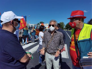 Il sindaco di Castekfidardo, Roberto Ascani, al presidio dei lavoratori Elica davanti allo stabilmnento Fime