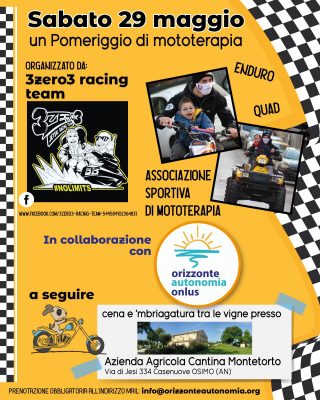 Esiste qualcosa di più bello di un pomeriggio di festa all’aria aperta per divertirsi insieme, grandi e piccoli, in sella a una moto di enduro o su un quad e da concludere tutti a tavola con una cena di gruppo? E’ un pomeriggio sorprendente di mototerapia, quello che oggi l’associazione ‘Orizzonte Autonomia Onlus’ di Camerano propone in collaborazione con ‘3zero3 racing team’ di Pesaro all’azienda agricola ‘Cantina Montetorto’ a Casenuove di Osimo. «L’abbiamo organizzato con questa associazione sportiva di mototerapia e grazie a questa iniziativa inclusiva 12 ragazzi con disabilità della zona correranno con quad e moto enduro insieme a Manuel Reggiani, il campione pesarese di sport acquatici. Abbiamo già parecchie adesioni, ma è ancora possibile prenotarsi per partecipare» spiega Giulia Fesce, presidente di ‘Orizzonte Autonomia Onlus’. (info. per prenotazioni su: info@orizzonteautonomia.org). L’associazione, sostenuta dall’attrice anconetana Lucia Mascino che dal 2015 ha scelto di diventarne testimonial, è nata nel 2012 a Camerano per supportare lo sviluppo, la crescita, l’integrazione sociale e il percorso verso l’autonomia di bambini con disabilità motorie, dovute in particolare a patologie che provocano malfunzionamenti a carico del sistema nervoso centrale con conseguente compromissione motoria. Per perseguire questi obiettivi l’associazione si avvale da sempre del metodo della Conductive Education (Ce), un sistema integrato di educazione cognitiva, fisica, sociale, nato in Ungheria negli anni ’50 ad opera del Neuropsichiatra Andràs Petò e sviluppatosi poi in tutto il mondo, sebbene in Italia resti ancora poco conosciuto. La onlus collabora con progetti regionale e comunali con la scuola pubblica. Anche ‘3zero3 racing team’ di Reggiani è da tempo è impegnato in progetti che uniscono sport e disabilità.