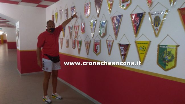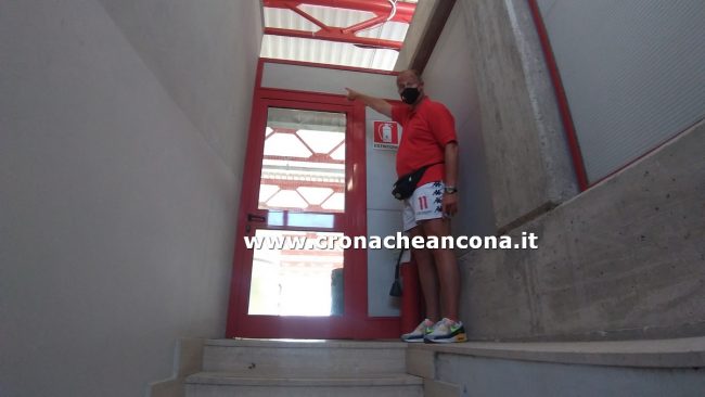 Mirco Filippetti, uno dei custodi del Del Conero, mostra la porta forzata degli spogliatoi