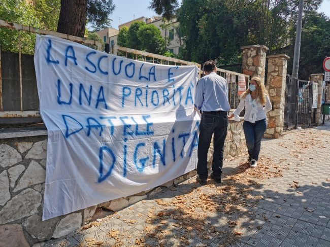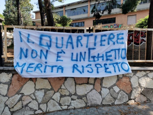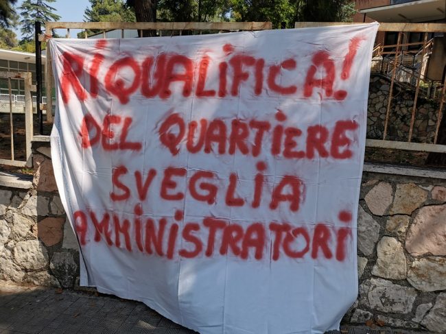 Marciapiedi con le mattonelle divelte, erba alta e ferri arrugginiti. Sono solo alcuni dei pericoli segnalati dai residenti di via Torresi che, questa mattina, sono scesi in strada per una protesta pacifica, appendendo alle ringhiere delle scuole Domenico Savio dei messaggi destinati al Comune: «Riqualifica del quartiere, sveglia amministratori»; «Il quartiere non è un ghetto, merita rispetto».