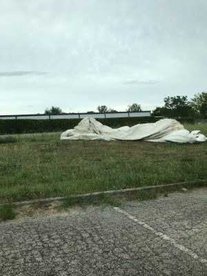 Il manto di copertura della piscina comunale di Osimo tolto come ogni anno dall’impianto natatorio per la stagione estiva ma abbandonato sull’erba dell’aiula del parcheggio di via Vescovara