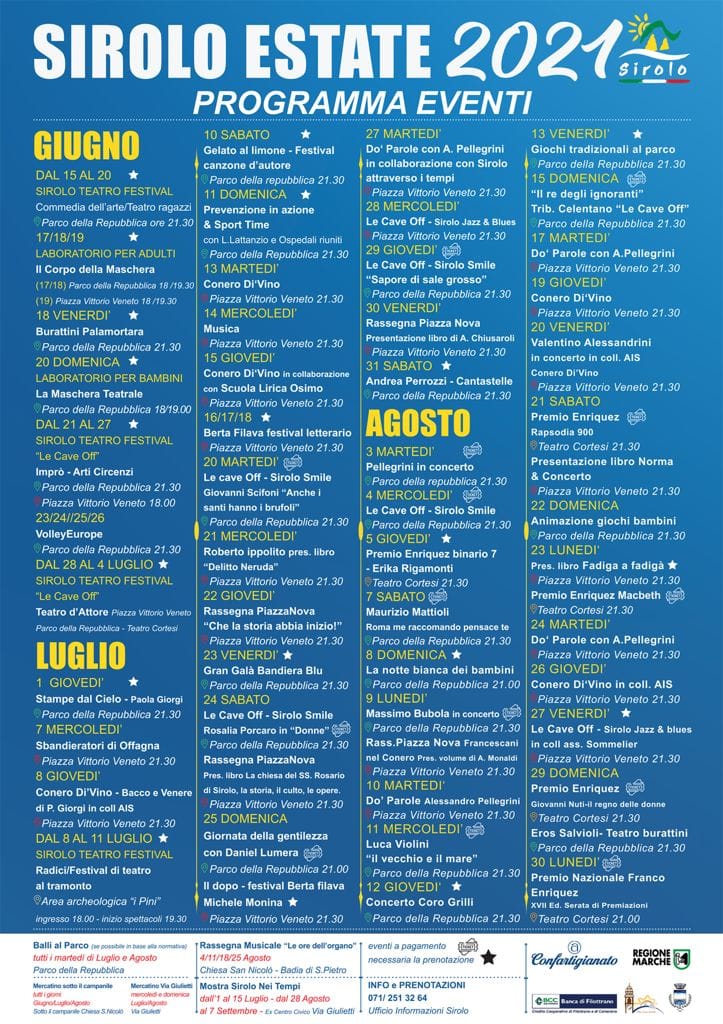 La cucina satellite degli studenti dell’Alberghiero di Loreto sarà una delle tante novità che riserverà ai turisti l’estate sirolese. La scorsa settimana, in piazza Vittorio Veneto, il sindaco Filippo Moschella e l’assessore al Turismo e Cultura Barbara Serrani, hanno infatti presentato il cartellone degli eventi che animeranno le sarete d’estate fino al prossimo 30 agosto. Ben novanta appuntamenti per tutti i gusti che troveranno l’espressione massima nella XVII edizione del Premio nazionale Franco Enriquez, in programma dall’1 al 30 agosto con due date all’aperto, quella del 9 con il concerto di Massimo Bubola al parco della Repubblica e quella del 30 a piazzale Marino per la presentazione del libro dedicato al regista, curato dal direttore artistico Paolo Larici. Oltre alla kermesse dedicata ai comici di ‘Sirolo smile’ confermato per il 23 luglio anche il galà della 28esima Bandiera Blu e per i più piccoli, l’8 agosto, la Notte Bianca ma su prenotazione. Ci saranno anche i festival e la rassegna ‘PiazzaNova …di Storie, di Uomini, di Opportunità’ con l’archeologo Maurizio Bilò e il Circolo Culturale di Sirolo.