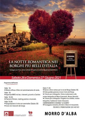 Dopo il tramonto, il borgo si spegnerà illuminandosi d’Amore. Musica e atmosfera romantica caratterizzeranno la passeggiata per “La Scarpa” alla luce delle candele e, grazie alla collaborazione dell’associazione Armati dell’Antica Marca, sabato 26, vedremo sfilare Dame e Cavalieri in abiti trecenteschi, celebrare l’Amor Cortese per le vie del borgo, e danzare dolci melodie per rivivere l’atmosfera di altri tempi. A mezzanotte, in questo affascinante scenario, gli innamorati si scambieranno il tradizionale bacio e brinderanno rinnovando le loro promesse d’amore, mentre la musica continuerà ad accompagnarli fino a tarda notte. Morro d’Alba, il borgo del vino Lacrima e del camminamento di ronda più suggestivo delle Marche, vi aspetta per avvolgervi nella magica dimensione della Notte Romantica dei borghi più belli d’Italia 2021 (info. sul sito www@morrodalba.com e il profilo fb Morro d’Alba- Eventi nel Borgo).