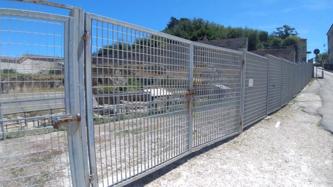 Cosa positiva, in questo caso, è che il pannello si trova all’esterno della recinzione ma allo stesso tempo non serve a nulla risultando illeggibile. Invece, dirigendoci verso l’anfiteatro in direzione di via Birarelli, questa volta i pannelli sono stati installati all’interno ma, per leggerli, si dovrebbe scavalcare una recinzione. Si prosegue ancora fino ad arrivare al vero e proprio anfiteatro i cui cancelli sono chiusi con catene arrugginite e, anche in questo caso, i pannelli sono collocati all’esterno.