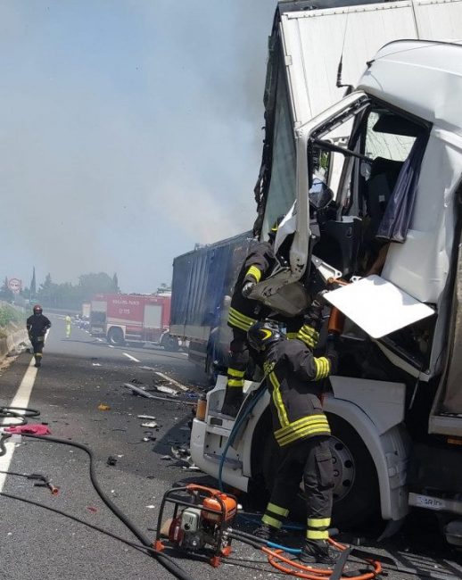 Sono di Jesi, in provincia di Ancona, e di Cepagatti, in provincia di Pescara, i due camionisti morti. Hanno entrambi una cinquantina di anni. Non sono invece gravi, per fortuna, le condizioni del terzo camionista che è stato trasportato all’ospedale di San Benedetto dall’ambulanza del 118. E’ quello che si trovava alla guida del primo dei tre tir protagonisti del tragico tamponamento che non lasciato scampo a chi si trovava al volante dei due bisonti che sono sopraggiunti alle spalle del primo tir. Sono stati momenti di grande panico, automobilisti e camionisti in transito hanno subito allertato i soccorsi e sul posto sono giunti i vigili del fuoco del Distaccamento di San Benedetto, ambulanze inviate dalla centrale operativa del 118, personale del Soccorso stradale e la Polizia Stradale. E’ intervenuta anche l’eliambulanza, giunta da Ancona, che non è atterrata, ma con un verricello ha calato due sanitari direttamente sul luogo del disastro. I pompieri hanno subito cercato di spegnere le fiamme, ma soprattutto cercare di tirare fuori dall’abitacolo una dei due camionisti morti, che è rimasto incastrato dentro. Subito dopo lo schianto, all’interno del tratto, è stato chiuso il traffico. Si sono registrati tre chilometri di coda. In corrispondenza dell’uscita – obbligatoria – di San Benedetto si sono registrati due chilometri di coda. Sono intervenuti volontari della Protezione Civile che sta provvedendo a distribuire bottiglie di acqua ad automobilisti e camionisti rimasti bloccati sotto il sole infernale.