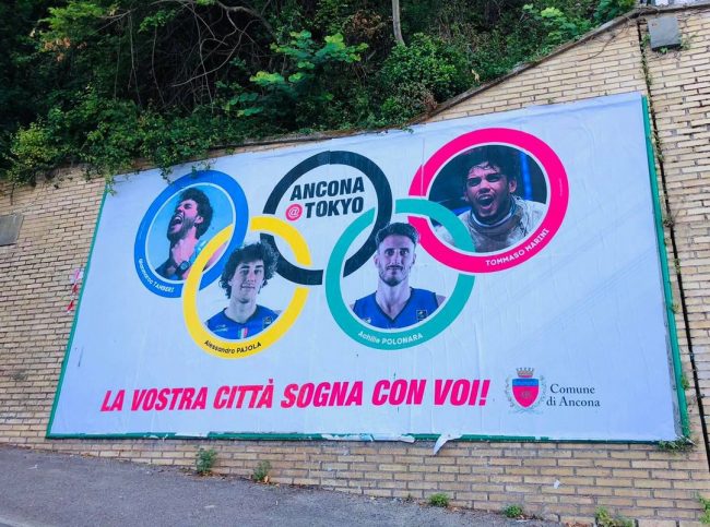 Mega manifesti in città per supportare gli atleti anconetani a Tokyo. Sono comparsi questa mattina in vari punti del capoluogo per dare l’in bocca al lupo ai cestisti Achille Polonara, Alessandro Pajola, al saltatore Gimbo Tamberi e allo schermitore Tommaso Marini. Saranno loro a rappresentare i colori biancorossi alle Olimpiadi, il cui debutto è fissato per venerdì. Il sindaco Mancinelli: «Volevamo farvi sapere quanto siamo orgogliosi di voi e del vostro talento.. di 4 ragazzi anconetani alle Olimpiadi. In bocca al lupo ragazzi».