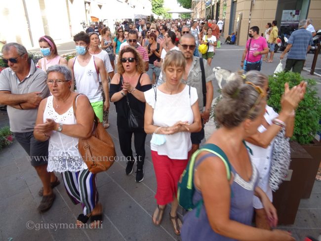 Armati di striscioni e cartelli riportanti frasi quali: «Vaccini = morte; politici italiani = criminali venduti», «Libertà di scelta» ed altro, il corteo si è formato in piazza Cavour proseguendo quindi lungo corso Garibaldi al coro: «Libertà, no Green Pass» e arrivando poi in piazza della Repubblica, in piazza del Plebiscito per poi risalire il centro e fermarsi quindi davanti al Comune. Il corteo è stato seguito dagli uomini della questura e dell’Arma. La manifestazione, oltre ad Ancona, è stata indetta anche in altre città d’Italia.