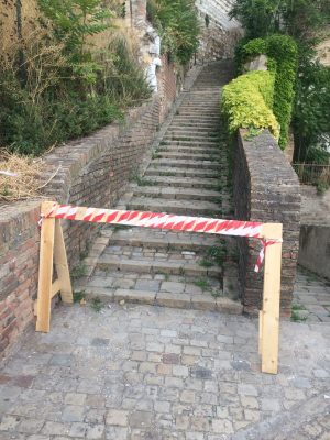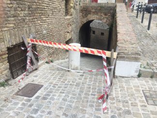 Trema e non trova pace lo storico rione Guasco. Trema perché continuano a piovere pietre su un territorio sempre più “bagnato” da zone off limits e transennamenti, e stavolta è il turno del medievale e (per fortuna) solo pedonale Volto dei Seniori o dei Signori. Chiuso nella mattinata di sabato scorso dai vigili del fuoco, che hanno posto gli ennesimi cavalletti di legno col nastro biancorosso che avverte del pericolo. Già, pericolo. Perché nel caso di questa ennesima emergenza urbanistica – scattata il giorno prima del mega-sbarramento in via Pizzecolli causa cornicione pericolante – le pietre, in realtà antichissimi mattoni, sono rotolati giù per la scarpata che si estende a quota più elevata lungo buona parte del lato destro della tortuosa arteria (per chi scende dal suo imbocco in piazza Stracca sotto il soffitto voltato), ma si sono fermate prima della murata di contenimento. Tuttavia i reperti lapidei hanno raggiunto alcune parti di Palazzo Fatati, l’edifico che si erge sul fianco destro di Palazzo degli Anziani, da cui appunto è separato dal Volto dei Signori. Risultato: la decina di condomini di Palazzo Fatati si ritrovano sul classico orlo di una crisi di nervi. In quanto i pompieri hanno posto transenne, dividendolo in due, anche in un terrazzo di proprietà di una residente al piano terra; terrazzo che una signora ha affittato assieme ad un appartamento ad un coinquilino, e la porzione del terrazzo resa impraticabile è proprio quella di pertinenza del locatario. Quanto agli altri abitanti di Palazzo Fatati, a crear loro problemi sono le ulteriori transenne montate alla fine della stradina privata in discesa tramite la quale si accede al garage dell’edifico. Ed entrare ed uscire con le auto è diventato un rompicapo di precisione. Il mezzo terrazzo e il piccolo slargo per le manovre da e per il garage sono stati sfiorati dai mattoni “ruzzolanti”. Ecco perché i vigili del fuoco ci sono andati giù pesante con la messa in sicurezza. Doverosamente, va aggiunto. In quanto la fonte dei distacchi e del rischio, incombente su parte di Palazzo Fatati e su Volto dei Signori, è un rudere plurisecolare senza tetto, a forma di parallelepipedo, che si erge su, dov’è la scarpata erbosa che va a confinare col Palazzo Ferretti (sede del Museo Archeologico Nazionale delle Marche) e con una centralina elettrica ad esso funzionale.