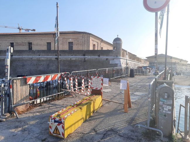 «Si prega di usufruire dell’ingresso principale della Mole». E’ il contenuto del cartello appeso a una delle transenne installate sul ponticello del Lazzaretto, quello che conduce al chiosco e, poi, al ristorante Stamura. «È stato già interdetto il transito del natanti sotto il ponte con un semplice nastro bianco/rosso di emergenza che è poi risultato rotto – ha detto la consigliera leghista Antonella Andreoli -. È fondamentale che il ponte venga messo in sicurezza con estrema urgenza e con gli opportuni sistemi tecnici: reti, pali, traverse in legno o metallo al fine di permettere il passaggio pedonale, già ora possibile, e dei natanti sotto il ponte, ciò fino alla fine della stagione estiva al fine di non compromettere la stagione estiva per chi possiede una barca. Il divieto di sostare sul ponte pericolante comprova anni e anni di incuria e mancanza di manutenzioni da parte di chi evidentemente aveva altre priorità. Dopo le gradinate del Passetto inagibili e a rischio crollo a causa di decenni di mancanza di cure e manutenzione ora è il turno del Lazzaretto».