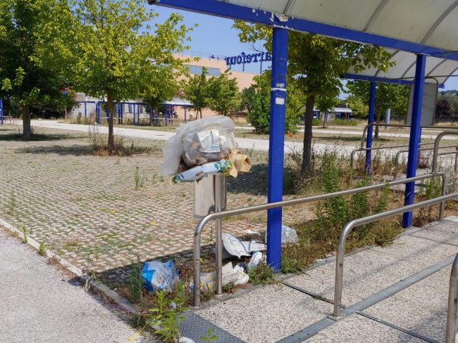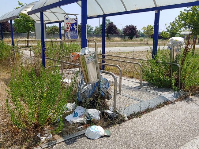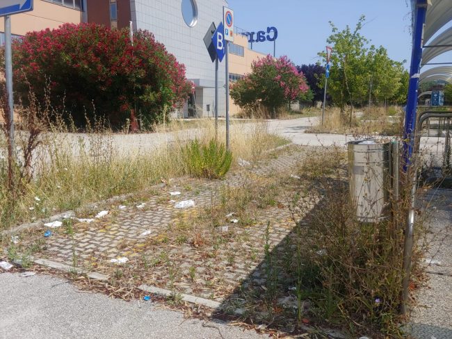 Un parcheggio trasformato in una discarica a cielo aperto. E’ la parabola della zona posteggi esterna del Carrefour, ipermercato di Camerano chiuso quattro mesi fa, con l’esubero di quasi cento dipendenti. Da quanto ha cessato la sua operatività, il primo aprile 2021, la parte che un tempo era dedicata ai parcheggi scoperti è sempre più scivolata nel degrado. Non si conta la mole di spazzatura che si può trovare in un ogni angolo del parking, soprattutto quello più esposto a sud, più lontano dagli ingressi del Grotte Center. I rifiuti più massicci sono stati gettati in alcune aiuole oppure nei pressi degli stalli dove un tempo trovavano posto i carrelli. Si possono vedere mascherine, sacchi dell’immondizia, cartoni di pizza, resti di cibo, bevande e patatine del fast food. Segno, forse, di alcuni bivacchi notturni. Come se non bastasse, davanti a uno degli ingressi dell’ex ipermercato è stato divelto un dissuasore di cemento, con i cocci rovinati a terra. In alcuni punti, ma forse questo è il male minore, l’erba è così alta che si fa fatica ad uscire dall’auto.