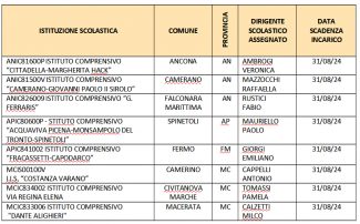 Per Ancona nel dettaglio la mappa delle dirigenze scolastiche per gli Istituti comprensivi, alla vigilia dell’avvio dell’anno scolastico 2021-2022 ora è completa: il ‘Ancona Nord’ è diretto da Lorella Cionchetti; il ‘Cittadella Margherita Hack’ da Veronica Ambrogi; il ‘Pinocchio Montesicuro’ da Michela Antonella Vincitoriolo; lo ‘Scocchera’ da Maria Costanza Petrini; il ‘Novelli Natalucci’ da Lucia Cipolla; il ‘Grazie Tavernelle’ da Silvia Del Monte; il ‘Quartieri Nuovi’ da Giuseppe Minervini e il ‘Posatora Piano Archi’ da Stefania Tarini. Coperte anche le nomine delle dirigenze per gli istituti superiori sempre del capoluogo di regione. A luglio l’Ufficio scolastico aveva nominato Alessandra Rucci alla guida del liceo scientifico ‘Galilei’ e Maria Alessandra Bertini come dirigente scolastico dell’altro liceo ‘Savoia-Benincasa’. Al vertice del ‘Podesti Calzecchi Onesti’ c’è Laura Castellana; al ‘Rinaldini’, Angelica Baione; all’‘Edgardo Mannucci’, Francesco Maria Orsolini; al ‘Vanvitelli Stracca Angelini’, Francesco Savore e al ‘Volterra Elia’ Maria Rita Fiordelmondo.