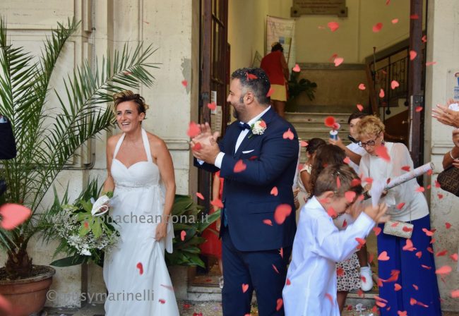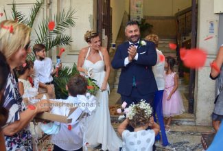 All’uscita dal Comune, ad attenderlo c’erano gli amici che si sono lasciati andare nel lancio di chicchi di riso, stelle filanti e un accorato: «Viva gli sposi!».