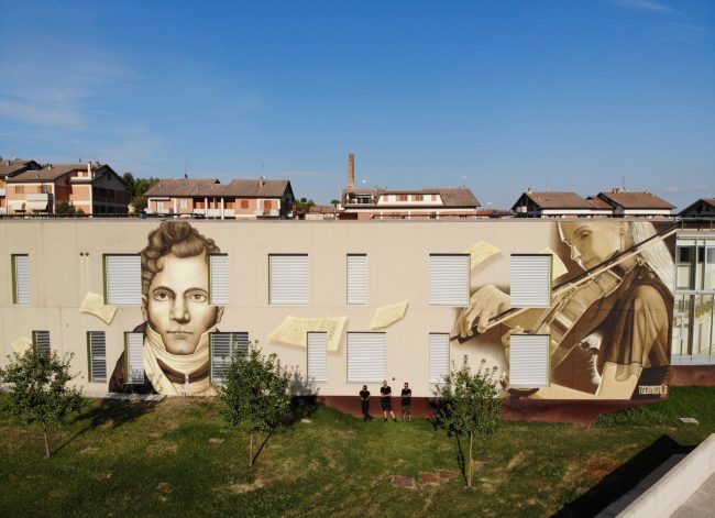 «Si tratta di un murale che rende omaggio al genio musicale di Gaspare Spontini, cui è intitolata la scuola secondaria di primo grado, che vanta un corso ad indirizzo musicale. – ricorda in una nota il Comune di Maiolati Spontini – L’opera rappresenta il volto di Gaspare Spontini, che prende magicamente forma dal violino suonato da una giovane ragazza. Nella parete, dove sono presenti diverse finestre, compaiono anche spartiti con le principali opere del compositore e alcune sue lettere, in particolare quella in cui formalizza la decisione di donare i suoi beni alla comunità maiolatese ed una in cui si rivolge all’amata moglie Celeste. I colori dell’opera sono sui toni del sabbia e del marrone, in coerenza con la tinteggiatura della parete». L’iniziativa del murale si inserisce nell’ambito dei progetti per il 250° anniversario della nascita di Gaspare Spontini che cadrà nel 2024. È intenzione dell’Amministrazione comunale organizzare una cerimonia pubblica, insieme con l’Istituto comprensivo “Carlo Urbani”, per presentare ufficialmente alla comunità l’opera che celebra Spontini.