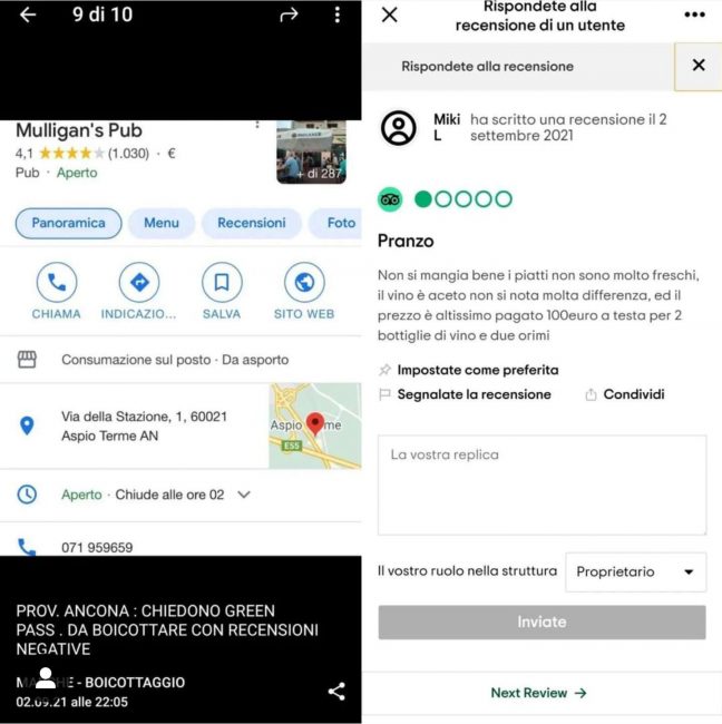 A sinistra, il messaggio social dei ‘No Green pass’, a destra la recensione negativa