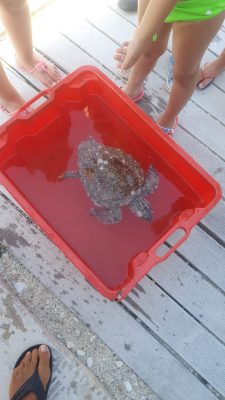 La tartaruga verrà curata da personale esperto: gli avventori della spiaggia, bimbi e adulti, che hanno seguito le operazioni di recupero, fanno il tifo per lei.