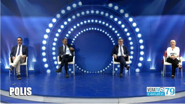 Da sin. Roberto Ascani, Tommaso Moreschi, Marco Tiranti e Gabriella Turchetti, i quattro candidati sindaco sfidanti per le elezioni amministrative 2021 di Castelfidardo, nel primo faccia a faccia organizzato da Vera Tv