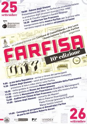 Sabato 25 il programma prevede, alle ore 18, la presentazione del libro “La Farfisa una eccellenza italiana – La produzione degli strumenti musicali (1946-1998) presso il salone degli Stemmi del Comune di Castelfidardo. Seguirà l’inaugurazione della mostra di strumenti musicali Farfisa. Domenica 26 si proseguirà con il ricevimento dei partecipanti nel Salone degli Stemmi, dove verranno proiettati filmati storici, tra cui quello del reparto pianoforti Farfisa. A seguire: visita al Museo internazionale della Fisarmonica, a quello del Risorgimento e alla fisarmonica più grande del mondo. Alle 18 si terrà la consegna di pergamene a persone che si sono distinte per la loro fattiva collaborazione alla Associazione Culturale. Seguirà il concerto musicale conclusivo, che vedrà Mirco Patarini alla fisarmonica e Paolo Principi accompagnare al pianoforte il violinista osimano Marco Santini sulle note di Ennio Moricone. Un programma per celebrare al meglio il nome di Farfisa nel mondo. Lo stesso Gervasio Marcosignori, considerato il più grande fisarmonicista di tutti i tempi, chiese di farlo diventare un appuntamento annuale. Quest’ultima edizione, la decima, può contare anche sulla collaborazione del Comune di Castelfidardo e la Pro loco.