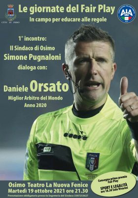 Il Comune di Osimo istituisce le ‘Giornate del Fair-play’ nell’ambito di una rassegna di cinque incontri aperti al pubblico con relatori ospiti speciali testimoni dei valori di legalità, correttezza e solidarietà. Il primo evento – fa sapere una nota dell’Amministrazione comunale – si terrà martedì 19 ottobre con Daniele Orsato, 45 anni, veneto, direttore di gare di serie A dal 2006 e premiato nel 2020 come miglior arbitro al mondo. Alle 18,15 sarà ospite in Sala Vivarini, a palazzo comunale, per ricevere il premio Fair-play “Sport e legalità”, con invito a presenziare esteso dal Comune anche ai presidenti regionali di Coni, Figc e Aia. Poi alle 21,30 al teatro La Nuova Fenice l’incontro pubblico durante il quale Daniele Orsato relazionerà assieme al sindaco Pugnaloni sull’educazione al rispetto delle regole, facendo emergere la sua testimonianza di questo concetto adattato ad un campo da calcio, comunque imprescindibile per lo sviluppo di una società civile. In teatro saranno presenti anche Juan Luca Sacchi, 37 anni originario di Treia anche lui arbitro di serie A e Katia Senesi, recanatese già arbitro fino al 2008 anche in categorie professionistiche e da qualche mese prima donna ad entrare nel Comitato nazionale dell’Associazione italiana arbitri. L’incontro al teatro sarà aperto ad ingresso libero ma con prenotazione necessaria al numero 3387253627 e obbligo di Green pass come da disposizioni nazionali. Per l’organizzazione il Comune ringrazia la collaborazione di Leonardo Puliti, osimano già componente della sezione marchigiana dell’Aia. Le successive Giornate del Fair-play vedranno come ospiti personaggi illustri del mondo politico, della cultura, della magistratura e delle istituzioni in generale.