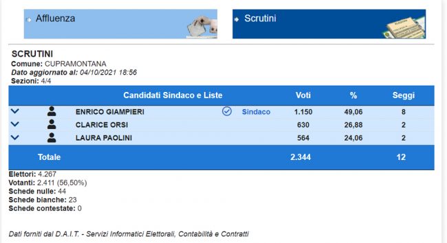 Non c’è stata storia a Cupramontana. Il sindaco Enrico Giampieri (‘Progetto Cupra’) ha vinto le elezioni comunali 2021 con 1.150 voti (49,06%) staccando di netto le avversarie Clarice Orsi (630 pari al 26,88%) e Laura Paolini (564 voti pari al 24,6%).