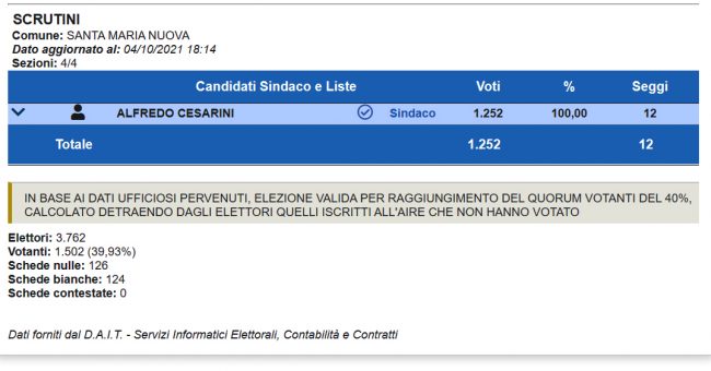 Ha battuto tutti sul tempo Alfredo Cesarini, 69 anni. E’ il primo sindaco eletto nella provincia di Ancona. L’unico candidato in lizza a Santa Maria Nuova per le Comunali 2021, è stato legittimato dal responso delle urne ad affrontare il secondo mandato amministrativo. Mentre lo spoglio delle schede si è appena concluso, è già ufficiale che nel paese di 4.199 abitanti e 3.762 elettori l’affluenza alle urne si è attestata sul 47,41%.