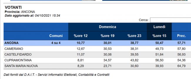 Aggiornamento delle ore 15.37 – E’ stata del 50.47% l’affluenza alle urne per il primo turno delle amministrative 2021 che ha interessato 4 Comuni della Provincia di Ancona, Castelfidardo (si è attestato 51,64% contro il 56,93% del 2016), Camerano (49,73% rispetto al 57,80% del 2016), Cupramontana (56,50% contro il 54,36% del 2016) e Santa Maria Nuova (percentuale parziale del 39,93% contro 65,79% del 2016). Il dato arriva dal Dait, i Servizi Informatici Elettorali, Contabilità e Contratti del Ministero. Rispetto alle precedenti amministrative si registra un calo di quasi sette punti percetuale (la volta precedente l’affluenza era stata del 57,71%). E’ in atto lo spoglio delle schede in tutte e 4 le città ed il conteggio del numero dei votanti in particolare per Santa Maria Nuova dove la somma va calcolata eliminando però gli elettori iscritti all’Aire. Il dato definitivo dell’affluenza stabilirà se è stato superato il quorum del 40% per legittimare l’elezione di Alfredo Cesarini, unico candidato sindaco in corsa.