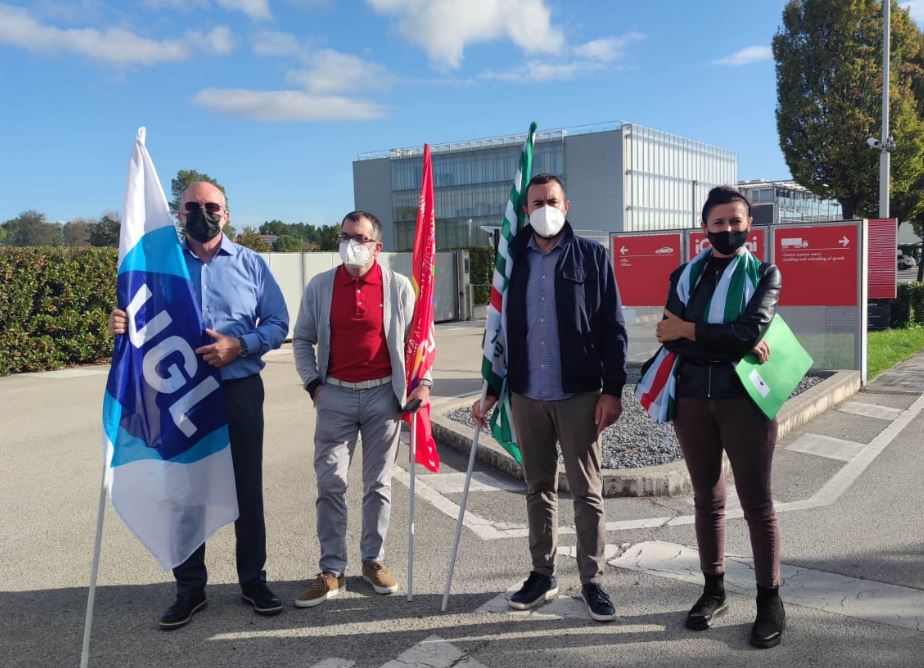 Alcuni sindacalisti di fronte alla Guzzini, al entro Giuliano Caracini con la bandiera verde della Cisl