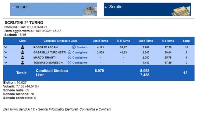 Il pentastellato Roberto Ascani è stato eletto oggi pomeriggio per la seconda volta sindaco di Castelfidardo con il 59,77% del consenso, dopo aver accarezzato la vittoria, lo scorso 4 ottobre, ma essere stato costretto a correre per il ballottaggio per soli 141 voti che lo separavano dal traguardo.