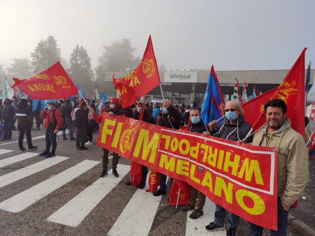 Una protesta organizzata nello stabilimento lombardo dal coordinamento nazionale Fim Fiom Uilm di Whirlpool. Insieme ad altri 500 lavoratori giunti da tutte la fabbriche italiane della multinazionale Usa oggi, 29 ottobre, hanno sfilato in corteo le delegazioni sindacali degli stabilimenti di Fabriano e Comunanza. L’adesione allo sciopero di 8 ore- fanno sapere i sindacati- è stata registrata al 100% in tutti i siti produttivi del gruppo (Pero, Varese, Melano, Siena, Fabriano, Comunanza, Carinaro e Napoli).