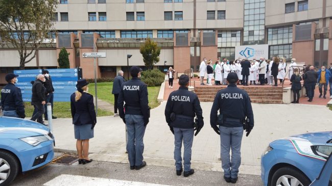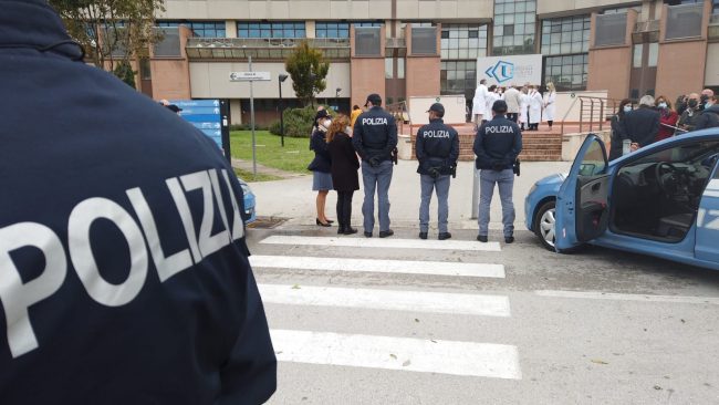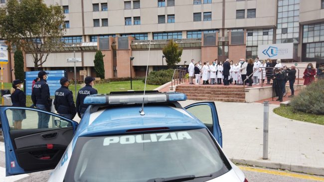 «In questo momento di emergenza epidemiologica, che registra una risalita dei contagi, in cui siamo fortemente impegnati ad assicurare il rispetto delle misure urgenti in materia di contenimento e gestione della pandemia, la mia personale gratitudine e quella delle donne e degli uomini della Polizia di Stato, al personale sanitario e volontario dell’Ospedale di Torrette, per il loro lavoro prezioso, insostituibile, premuroso, che continua a toccare con mano, ogni giorno, la sofferenza, il dolore, la disperazione e l’abbandono: un’autentica missione di umanità». Questo il messaggio del questore di Ancona Cesare Capocasa agli operatori sanitari incontrati questa mattina davanti all’ingresso dell’ospedale di Torrette. Assieme a lui, il vicario Federica Ferrari e  una delegazione della Polizia di Stato. Gli agenti hanno voluto portare un omaggio ed un messaggio di sostegno, a tutto il personale sanitario, che ormai da quasi due anni combatte, in prima linea, l’emergenza pandemica. Per esprimere il profondo senso di gratitudine, alcune volanti, a sirene spiegate, si sono schierate dinnanzi all’ingresso, portando il saluto al personale sanitario e volontario dell’ospedale di Torrette. Erano presenti il dg Michele Caporossi, una delegazione della Direzione medica, dirigenti medici e coordinatori dei vari reparti.