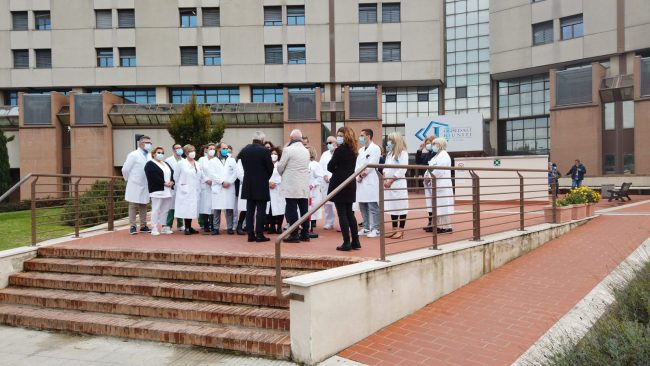 ANCONA - Questa mattina il questore Cesare Capocasa ha incontrato all'ingresso dell'ospedale una delegazione di medici e infermieri: «La mia personale gratitudine per il loro lavoro prezioso, insostituibile, premuroso, che continua a toccare con mano, ogni giorno, la sofferenza, il dolore, la disperazione e l’abbandono»