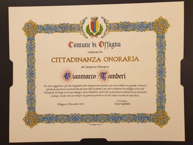 Oltre al presidente del Coni Marche, Fabio Luna, e a tanti altri ospiti, hanno animato la festa i tamburini e gli sbandieratori «nostre eccellenze che come te, Gimbo, portano alto il nome di Offagna e che sabato prossimo riceveranno a Milano il premio come miglior gruppo di rievocazioni storiche 2021» ha ricordato ancora il sindaco Capitani rammaricandosi solo di non aver potuto allestire gli stand con castagne e vin brule. «Il Covid avanza e abbiamo pensato bene di saltare la parte gastronomica ma ti riserveremo anche un’altra onorificenza per l’estate prossima» ha anticipato il primo cittadino. Si vocifera che Gimbo sarà nominato anche Cavaliere della Crescia durante le prossime Feste Medievali. L’olimpionico, da parte sua,  ha ringraziato emozionato per ricevere tanto affetto, salutando compagni di classe e maestre «Ogni volta che passo per queste vie mi affiorano tanti ricordi – ha sottolineato – Chiedo scusa se ci ho messo un po’ più  di tempo per essere qua con voi».