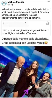 «Gravissime dichiarazioni dell’assessore all’ambiente Polenta». L’accusa arriva da Loretta Boni, portavoce di Altra Idea di Città, a seguito di un post condiviso dall’assessore del Comune di Ancona, Michele Polenta, sulla propria bacheca Facebook dove si vede l’ormai, anche questa virale, foto della giornalista di Toscana Tv, Greta Beccaglia, in posa con il procuratore sportivo Luciano Moggi. Nella foto vi è disegnata una freccia ad indicare la mano di Moggi appoggiata sulla giornalista. Un’immagine che l’assessore all’ambiente Michele Polenta ha postato sul proprio profilo commentando: «Nella vita si possono compiere delle azioni di cui poi ti penti, il problema è se ti capita di farlo con persone che non accettano le scuse esclusivamente per propria opportunità». La giornalista la scorsa domenica è stata molestata mentre stava facendo un collegamento da un tifoso della Fiorentina, il 45enne Andrea Serrani, ristoratore di Chiaravalle. Il concetto espresso da Polenta «minimizza quanto è successo alla giornalista Greta Beccaglia – denuncia Loretta Boni -, che è stata molestata sessualmente in diretta Tv mentre faceva il suo lavoro. Lo fa condividendo un altro post che ridicolizza la giornalista perché avrebbe già accettato in precedenza altri di questi “gesti”. Su quanto accaduto alla giornalista davvero se ne sono dette e lette di tutti i colori – prosegue – che ripropongono i clichè di sempre: è solo una goliardata… è una bella donna che si mostra e dunque può capitare ecc. ecc. Addirittura – prosegue – nel post l’assessore del comune di Ancona, Polenta, rimprovera la giornalista di non aver accettato le scuse del povero tifoso. Le donne e le femministe lo sanno, dentro un sistema patriarcale il nostro Paese ha un grave problema culturale che scivola sempre più in basso. Non ci troviamo di fronte soltanto a un gesto stupido, goliardico o di minor conto. Ma questo l’assessore Polenta proprio non lo capisce. Il 70% delle donne ha subìto discriminazioni sul lavoro e quasi il 50% (una su due) è stata oggetto di violenza, molestie o forme di controllo da parte del marito, del compagno o della famiglia. Il 63% delle donne che subiscono molestie o violenze non denuncia neppure l’accaduto, per sfiducia nelle istituzioni e nel sistema della giustizia». La portavoce sottolinea e ricorda poi come «il 25 novembre giornata mondiale contro la violenza maschile appena celebrata, le donne hanno manifestato per denunciare uno stato di cose che sembra non mutare, anzi. L’assessore Polenta rifrulla l’argomento. Lo scritto è vergognoso e ci sentiamo di stigmatizzarlo perché le istituzioni dovrebbero per prime emarginare pensieri di questo tipo gravi sul piano culturale e ancora più gravi perché affermato da chi co-governa una città. Proprio non ci basta – conclude – una panchina rossa davanti al Palazzo del Popolo in piazza 24 maggio».